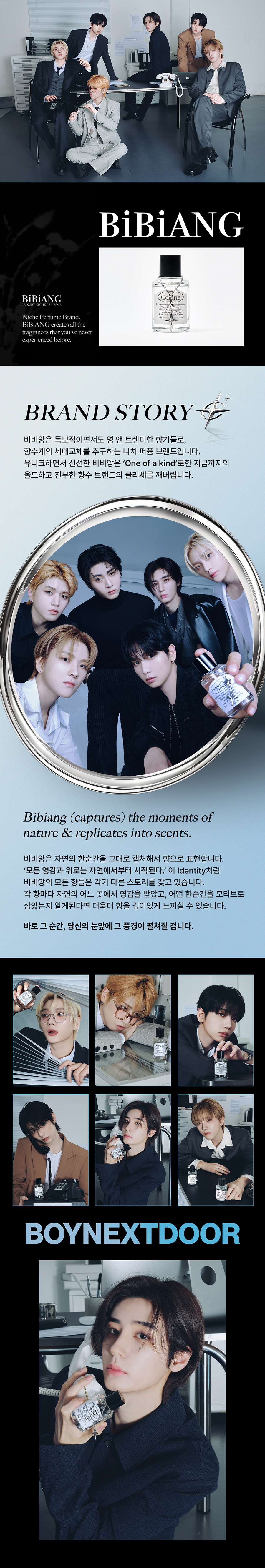 비비앙(BIBIANG)은 독보적이면서도 유니크하고, 영 앤 트렌디한 향기들로 향수계의 세대 교체를 추구하는 센세이셔널한 니치 퍼퓸 브랜드입니다. 자연의 한순간을 그대로 캡처해서 향으로 표현하며, 각 향마다 독특한 스토리텔링을 담고 있습니다.