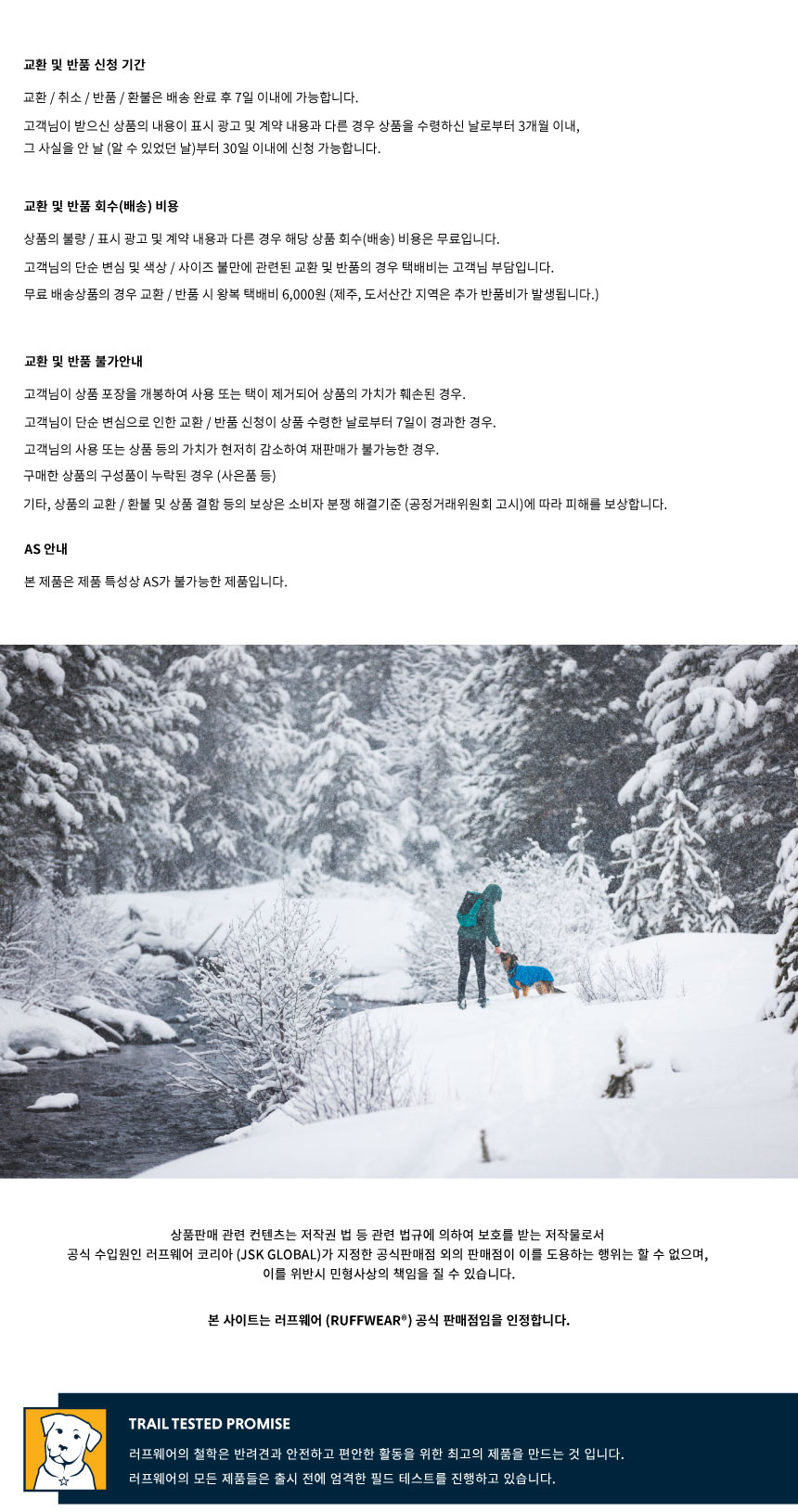 러프웨어(RUFFWEAR)는 그 이름만으로도 애견용품을 대표하는 최고급 브랜드로 미국 오리건주 밴드에 위치했습니다. 러프웨어의 철학은 개와 사람이 동료애를 느끼며 아웃도어 활동을 안전하고 편안하게 할 수 있는 최고급 아웃도어 애견용품을 만드는 것이며, 이를 위해 제품의 디자인, 소재를 그 목적에 맞게 설계/제작하고 있으며 지속적인 제품 개발을 통해 최고의 애견용품 업체로의 위상을 굳건해 하고 있습니다.