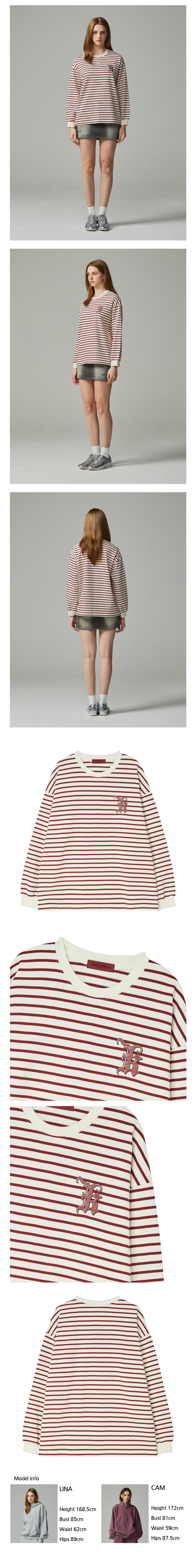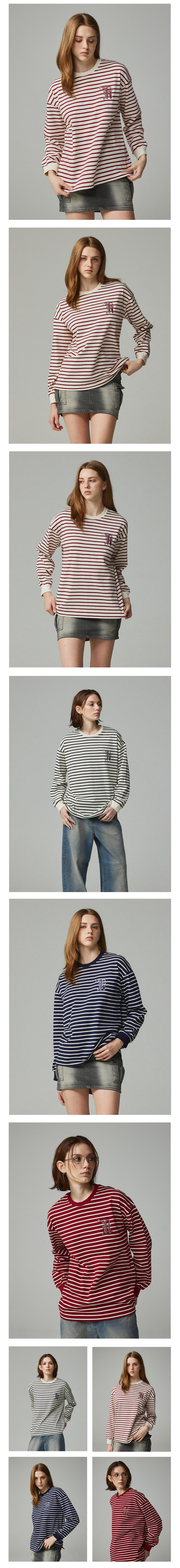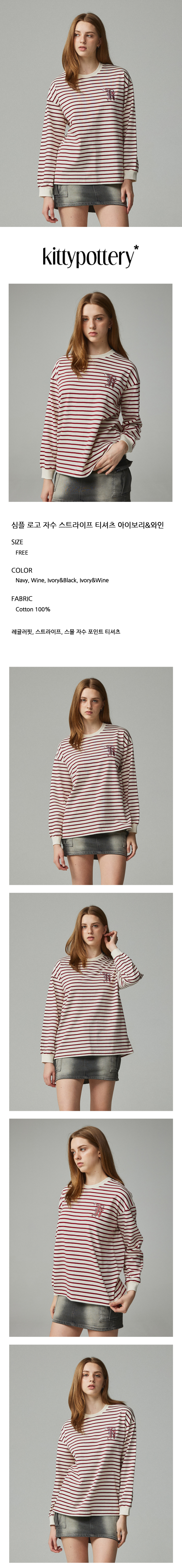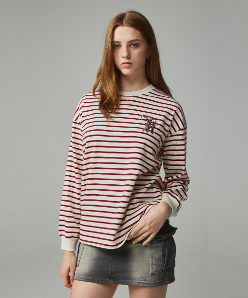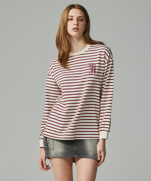심플 로고 자수 스트라이프 티셔츠 아이보리&와인