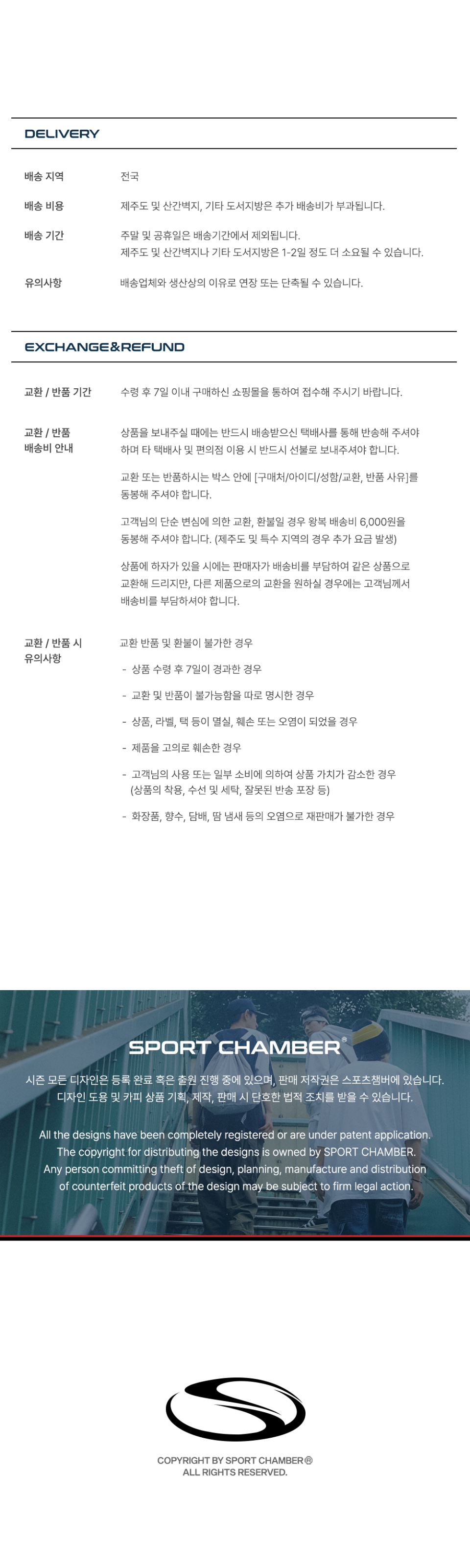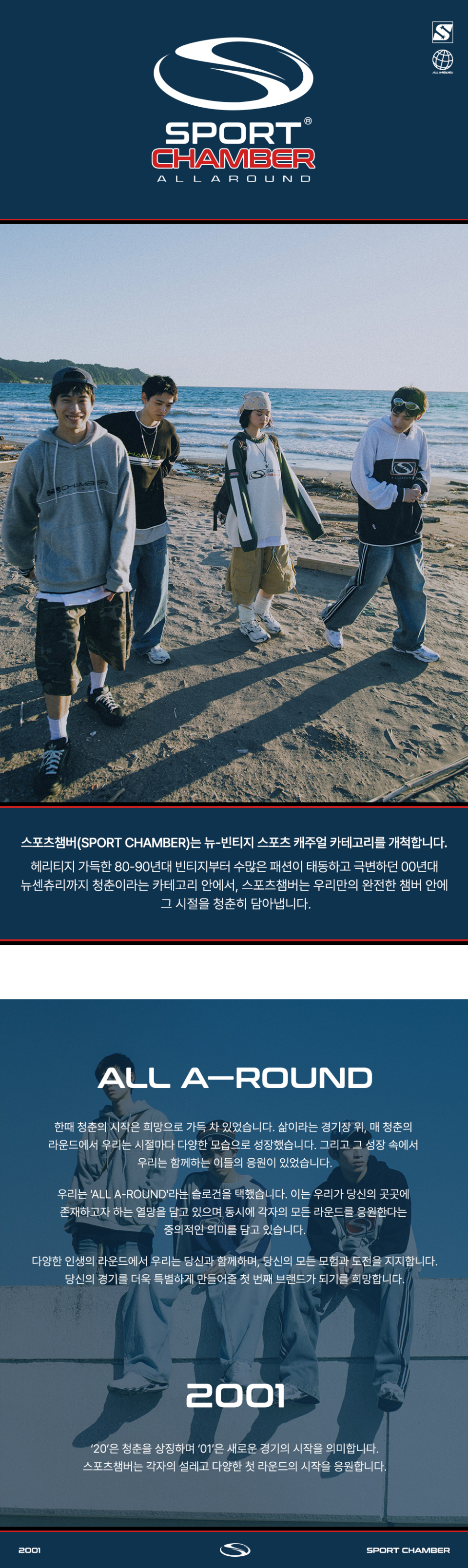 스포츠챔버(SPORT CHAMBER)는 뉴-빈티지 스포츠 캐주얼 카테고리를 개척하는 브랜드입니다. 헤리티지 가득한 80-90년대 빈티지부터 수많은 패션이 태동하고 극변하던 00년대 뉴센추리까지, 청춘이라는 카테고리 안에서 스포츠챔버는 우리만의 완전한 챔버 안에 그 시절을 청춘히 담아냅니다.