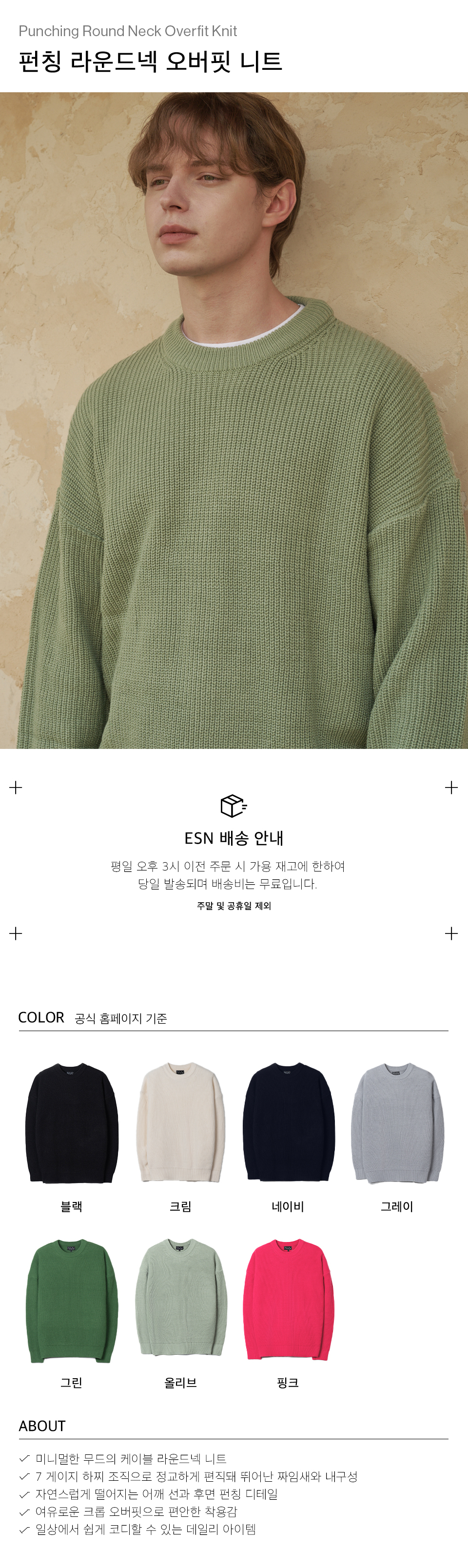펀칭 라운드넥 오버핏 니트 올리브