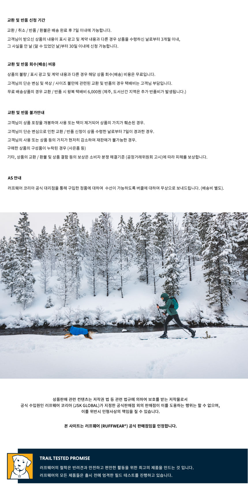 러프웨어(RUFFWEAR)는 그 이름만으로도 애견용품을 대표하는 최고급 브랜드로 미국 오리건주 밴드에 위치했습니다. 러프웨어의 철학은 개와 사람이 동료애를 느끼며 아웃도어 활동을 안전하고 편안하게 할 수 있는 최고급 아웃도어 애견용품을 만드는 것이며, 이를 위해 제품의 디자인, 소재를 그 목적에 맞게 설계/제작하고 있으며 지속적인 제품 개발을 통해 최고의 애견용품 업체로의 위상을 굳건해 하고 있습니다.