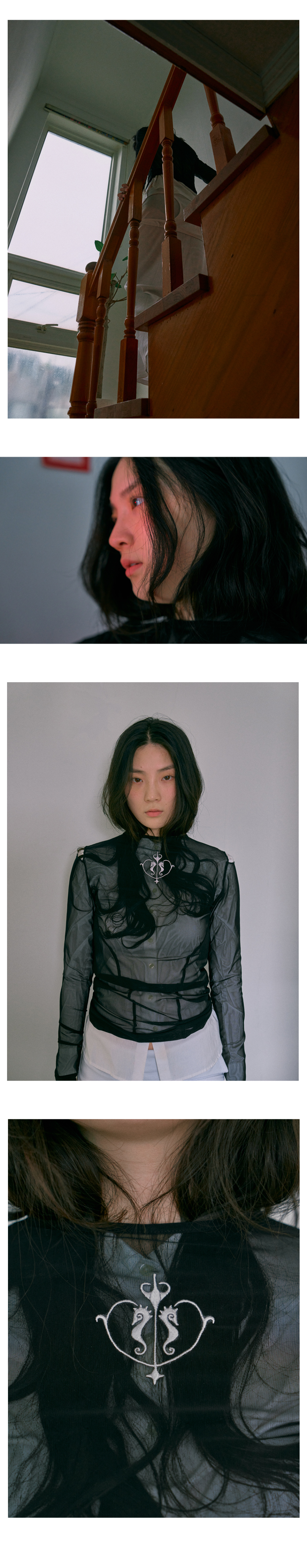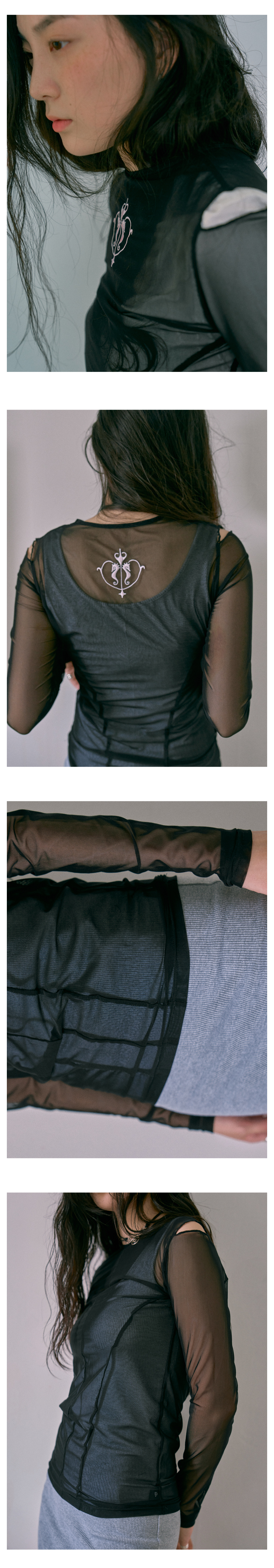 · 뒤 네크라인 실버 자수 포인트