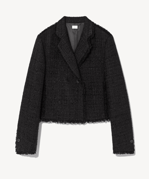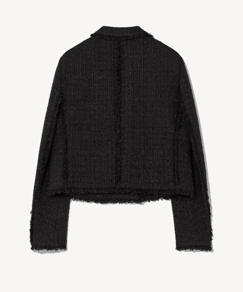 적당한 크롭 기장감과 절개 라인을 따라 섬세한 프린지 디테일이 돋보이는 재킷입니다