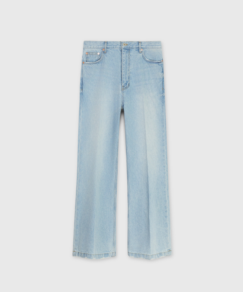 타일레 시그니처 데님 페이딩과 섬세한 다잉 이펙트가 더해진 데님 트라우저 입니다. ISKO® 프리미엄 레벨 데님을 사용해 오리지널 빈티지 컬러와 페이딩, 파트별 섬세하게 작업한 에이징 가공으로 자연스러운 발색이 특징입니다. 여유있게 밑단으로 넓어지는 와이드 플레어 실루엣에 미드 라이즈 포맷이며 오리지널 5포켓 데님 형식, 허리밴드 코아사 체인스티치 봉제 및 프리미엄 OG 데님 메이킹을 차용했습니다. 주머니 입구 리벳 마감, 후면 벨트라인에는 에이징이 더해진 부티크 패치가 있습니다.