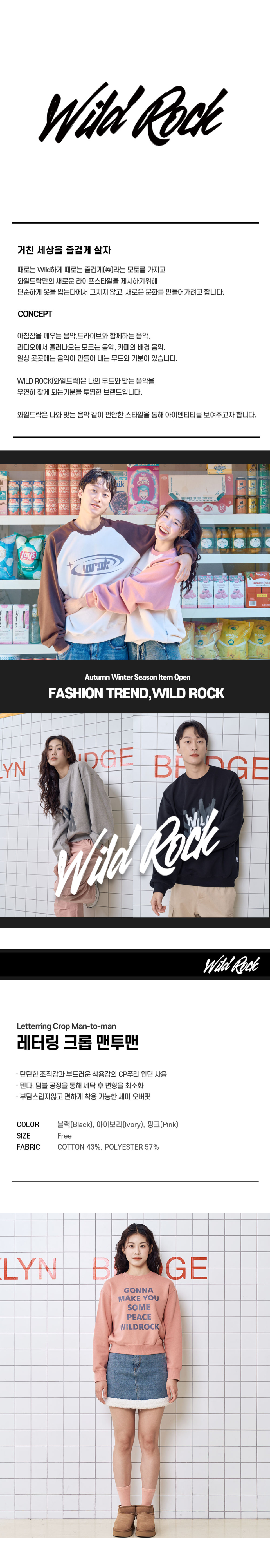 와일드락(WILDROCK)은 '樂 will never die'를 모토로 거친 세상을 즐겁게 살아가는 이들을 위한 스트릿 패션 브랜드입니다. 나의 무드와 맞는 음악을 찾아가는 과정처럼 자신과 맞는 편안한 스타일의 패션을 찾아가길 바라는 마음을 담았습니다.