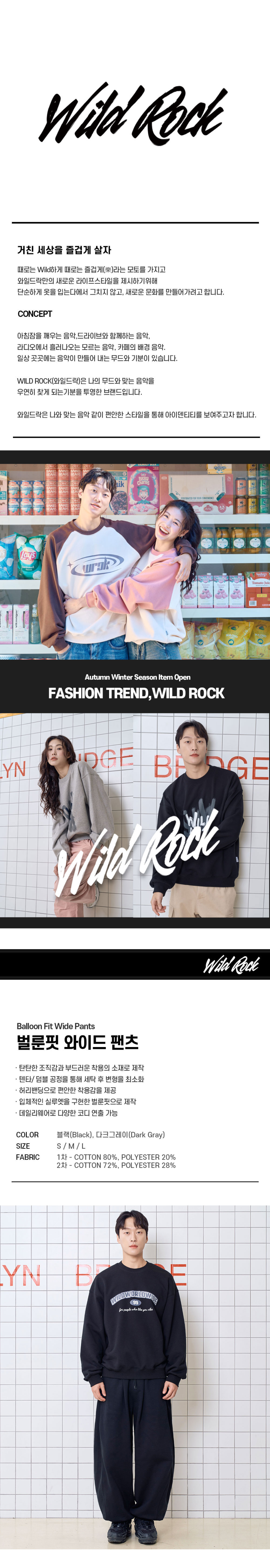 와일드락(WILDROCK)은 '樂 will never die'를 모토로 거친 세상을 즐겁게 살아가는 이들을 위한 스트릿 패션 브랜드입니다. 나의 무드와 맞는 음악을 찾아가는 과정처럼 자신과 맞는 편안한 스타일의 패션을 찾아가길 바라는 마음을 담았습니다.