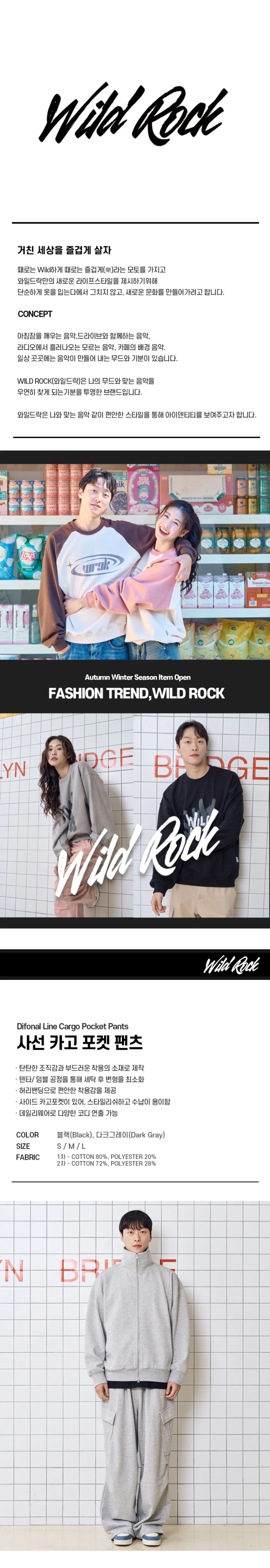 와일드락(WILDROCK)은 '樂 will never die'를 모토로 거친 세상을 즐겁게 살아가는 이들을 위한 스트릿 패션 브랜드입니다. 나의 무드와 맞는 음악을 찾아가는 과정처럼 자신과 맞는 편안한 스타일의 패션을 찾아가길 바라는 마음을 담았습니다.