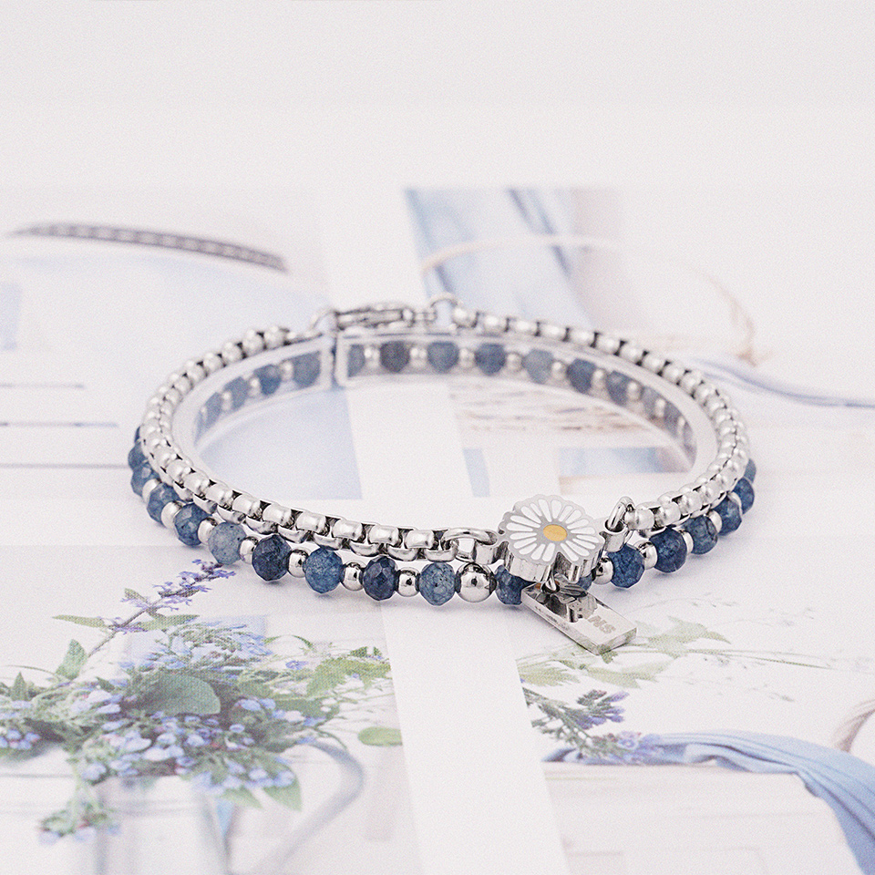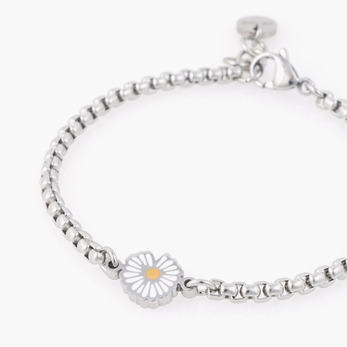 체인팔찌는 써지컬스틸로 제작된 데이지꽃 팬던트가 포인트로 장식되어 가볍게 코디하기 좋도록 디자인되었습니다.