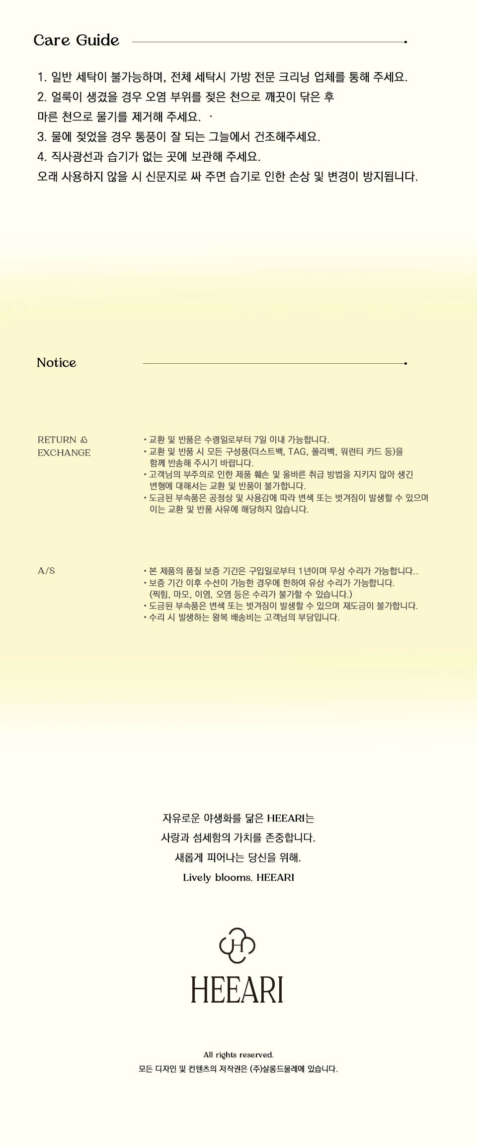 히어리(HEEARI)는 자유로운 야생화를 닮았으며, 새롭게 피어나는 당신을 위해 사랑과 섬세함의 가치를 존중합니다.