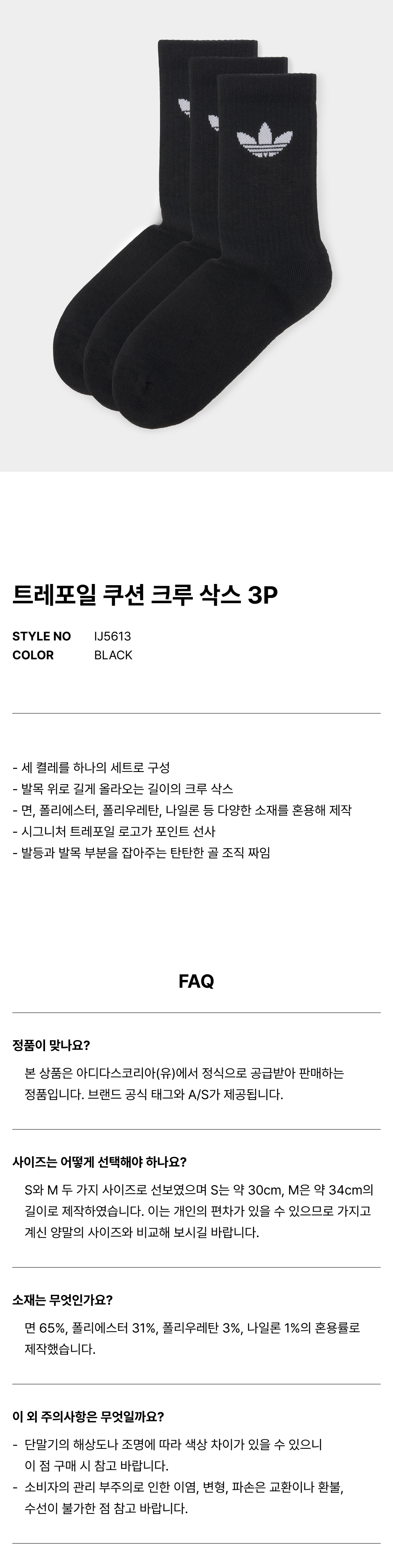 트레포일 쿠션 크루 삭스 3P - 블랙 / IJ5613