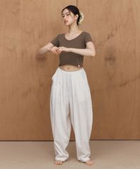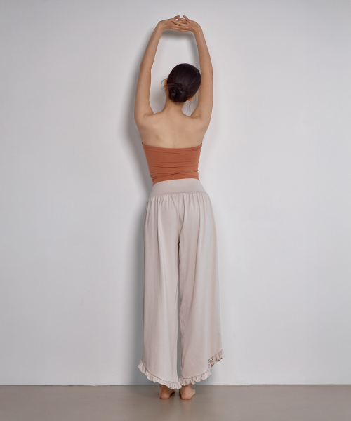 밑단 곡선 라인에 따라 러블리한 프릴 디테일이 들어간 디자인으로 루즈하고 자연스러움이 메인이 되는 편안한 수련복에 포커스를 맞춘 제품입니다. 입었을 때 누구나 어울리는 이지한 제품으로 인위적이지 않은 적당한 품으로 체형을 보정해주고 복원력이 좋은 신축성이 있는 원단을 사용해 부드러움에서 오는 포근함이 느껴지면서 활동 시에 더욱 더 가벼움을 느낄 수 있는 제품입니다. 적당한 밑위 기장 위쪽으로 복부를 충분히 감싸는 넓은 패브릭을 사용하여 안정감을 더했고, 어떠한 상의를 매치하느냐에 따라 young한 세련된 무드를 연출할 수 있는 고급스러운 핏감의 와이드 팬츠 입니다. 컬러별로 가지고 있는 무드가 다르기에 정말 강력하게 추천드려봅니다!