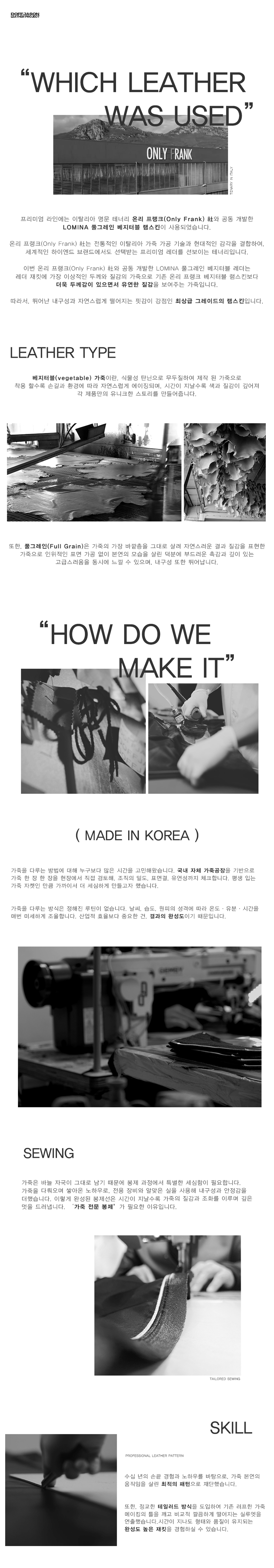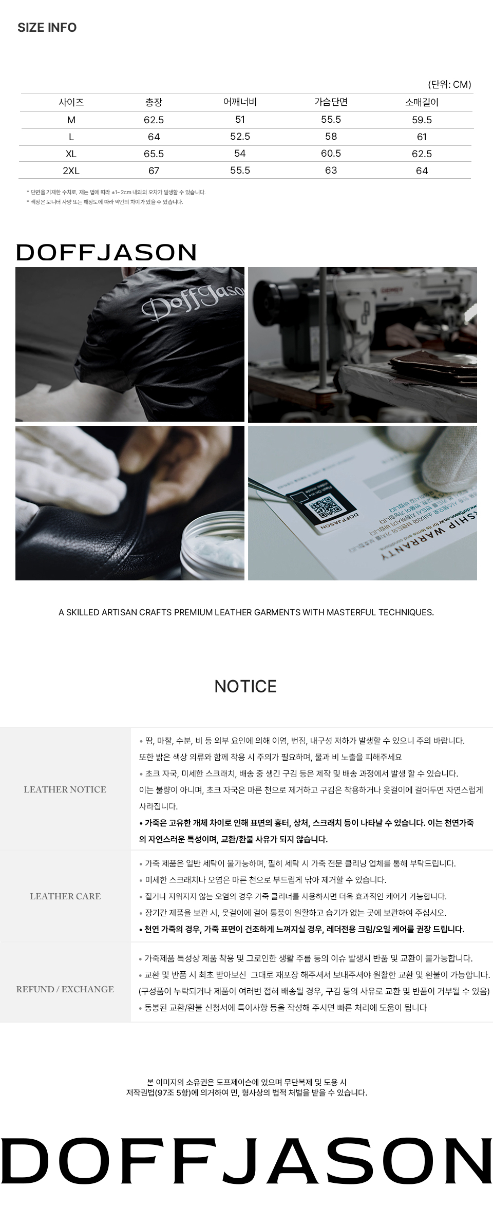 도프제이슨(DOFFJASON)은 가죽이라는 소재에 대한 이해를 기반으로 레더 가먼츠를 중심으로 디자인하는 브랜드입니다. 스타일에 구애받지 않고 오래 입을수록 가치를 더하는 타임리스 디자인을 추구하고, 절제된 디테일과 뛰어난 퀄리티의 아이템을 선보입니다.
