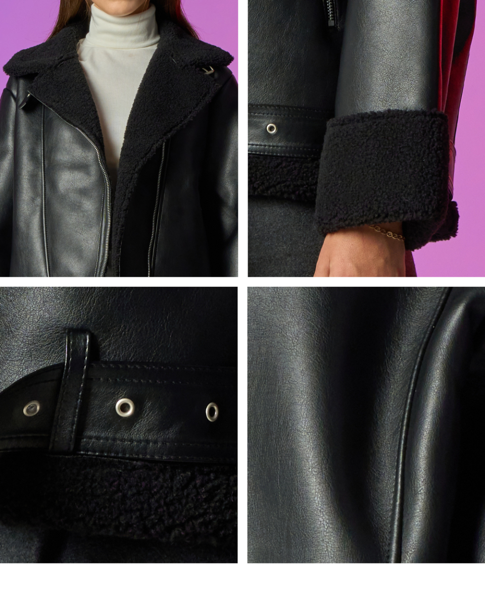 (남녀공용) 벨트탈부착 크랙 주름 오버핏 무스탕 자켓 [Black_White]