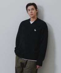 포인트 로고 펜던트 브이넥 케이블 니트 BK8941_블랙