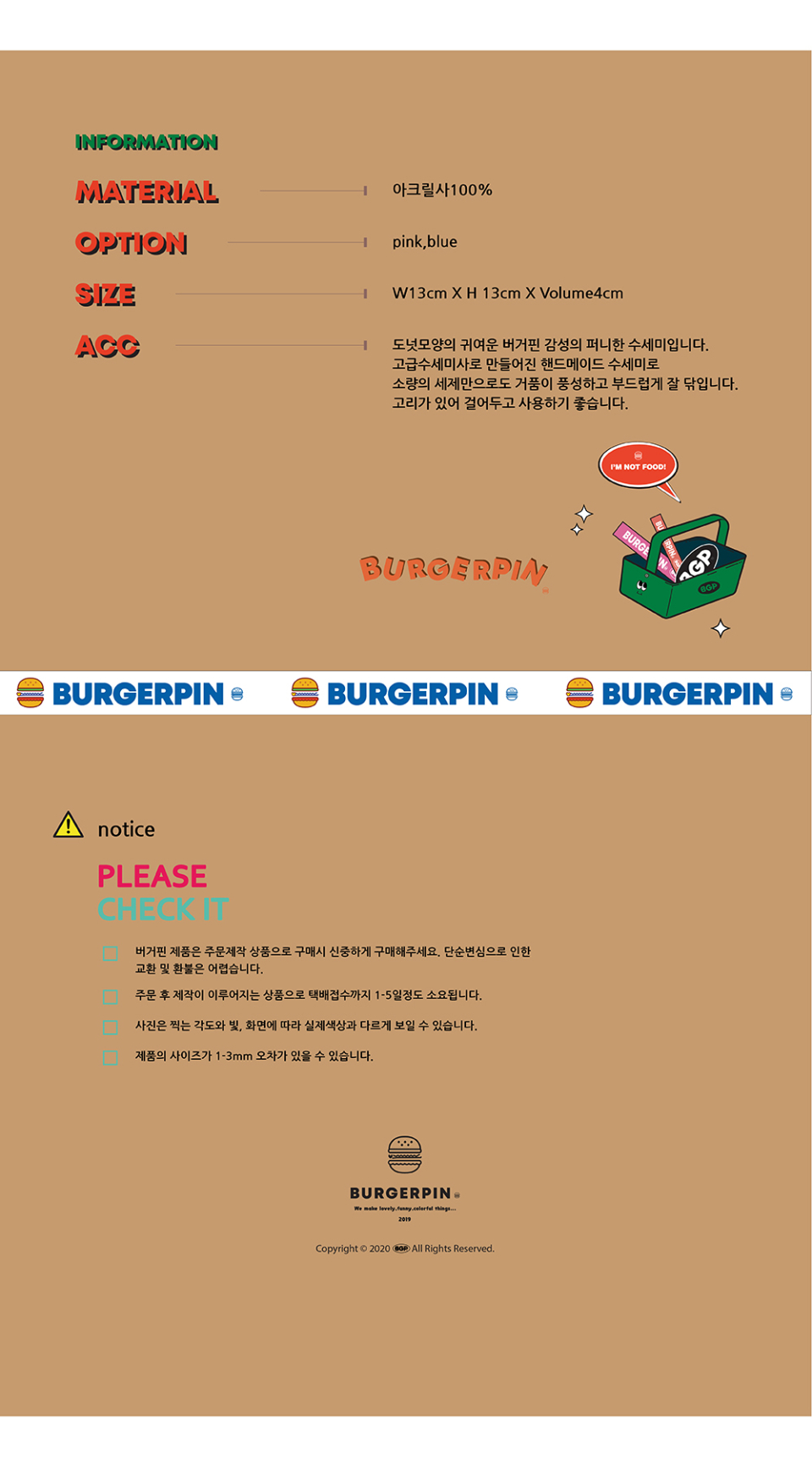 버거핀(BURGERPIN)은 러블리하고 퍼니한 일상 및 패션 소품과 디자인 아이템을 선보이는 브랜드입니다.