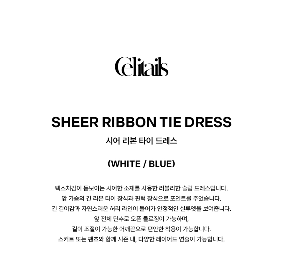 셀리테일즈(CELITAILS)는 러블리한 무드에 로맨틱한 디테일을 더해, 감각적인 실루엣과 다채로운 컬러로 일상에 설렘과 특별함을 전하는 브랜드입니다.