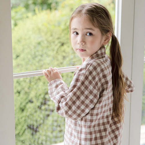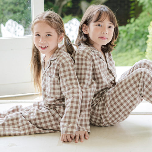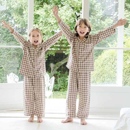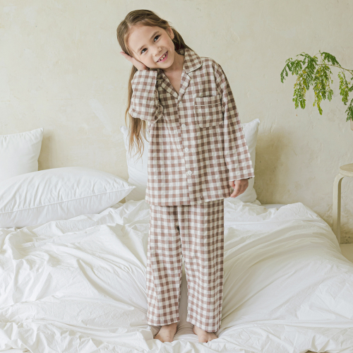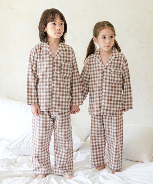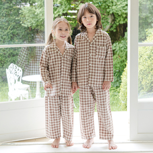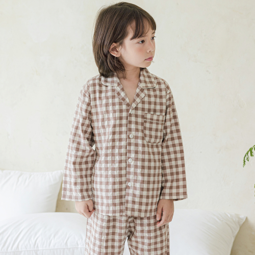 142 브라운 피치심플체크 긴소매 파자마세트