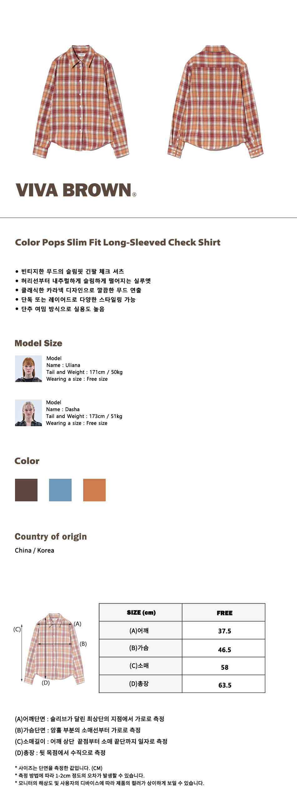 85-VIVA084 컬러팝스 슬림핏 긴팔 체크 셔츠 브라운