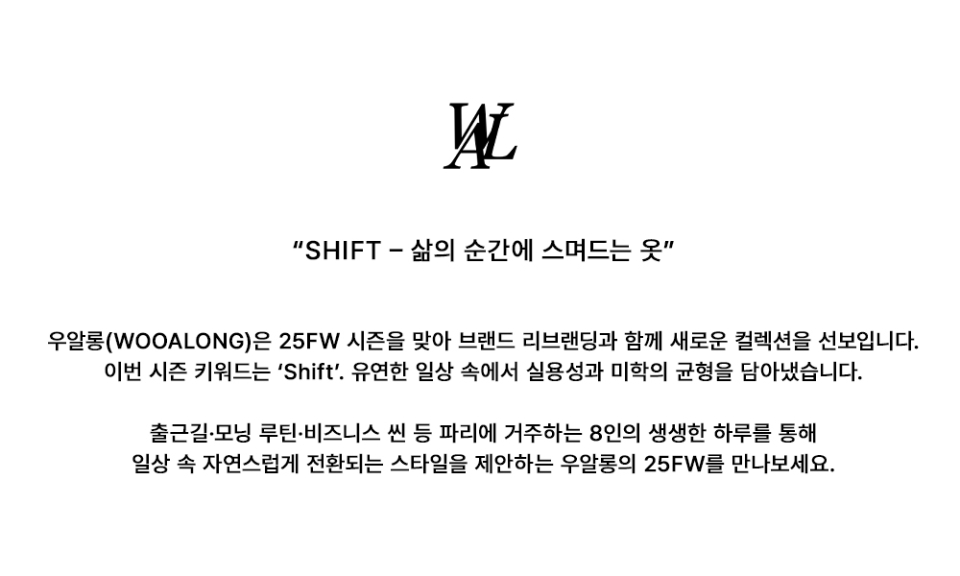 우알롱(WOOALONG)은 "Wear Actual Life, 실제 생활을 입다"라는 슬로건 아래 2018년에 시작되었습니다. 룩이 아닌 '옷'을 제안하며, 좋은 소재와 편안한 착용감을 바탕으로 다양한 서브컬처와 라이프스타일을 담아내기 위해 늘 고민하는 브랜드입니다.