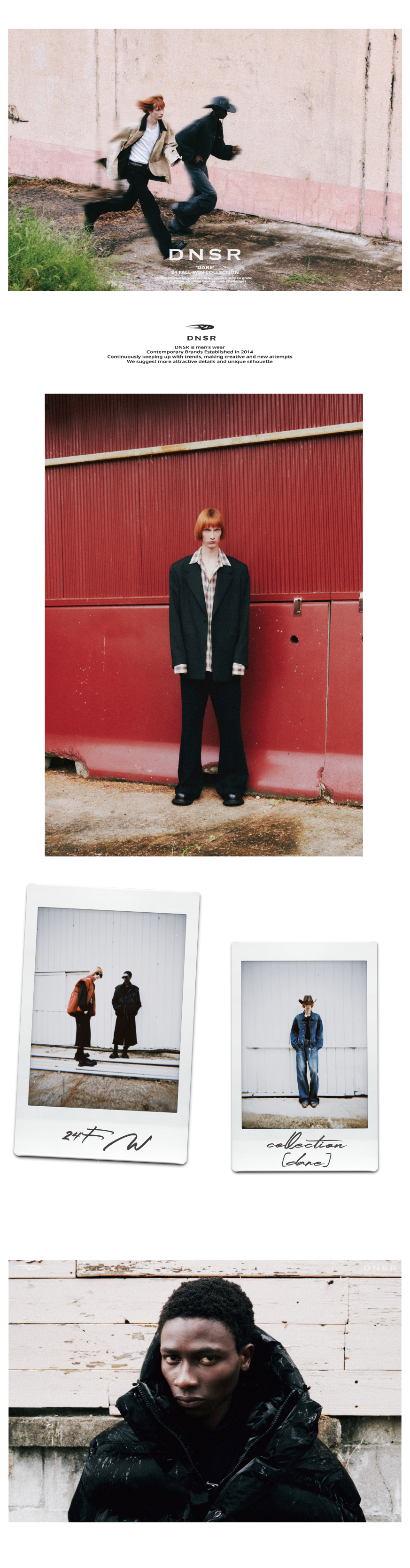 디앤에스알(DNSR)는 'Do New things, Something to realize'라는 슬로건을 바탕으로, 동시대에 흐름에 발 맞춰 항상 독창적이고 새로운 시도를 하고 있습니다. 디앤에스알의 DNA는 현대 복식을 기반으로 하는 오리지널리티의 견고한 테일러링을 고수하며 시대의 흐름을 읽고 변화하는 무드와 스타일링을 제안하는 스트릿 캐주얼 웨어입니다.