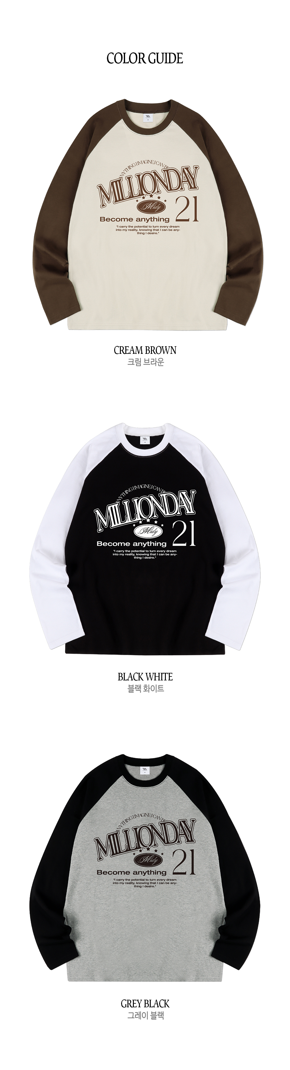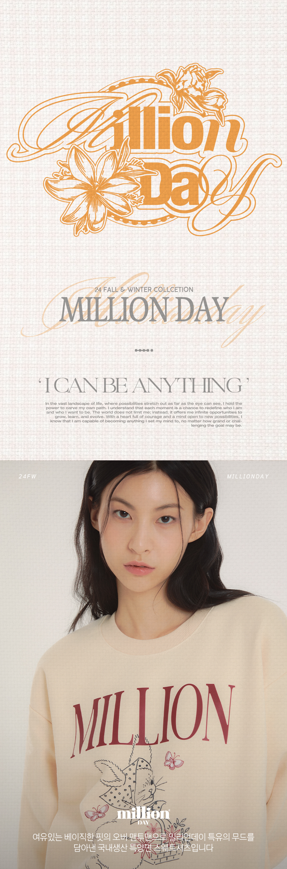 밀리언데이(MILLION DAY)는 'Anything can happen in a day(하루 안에 그 어떤 일이든 일어날 수 있다)'라는 슬로건 아래 키치한 그래픽과 디자인, 로고 플레이를 바탕으로 20~30대를 타깃으로 한 영 캐주얼 브랜드입니다.