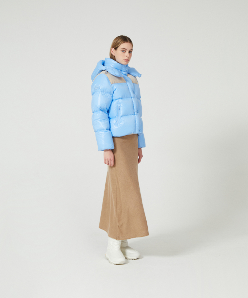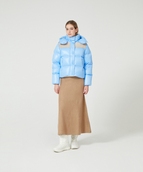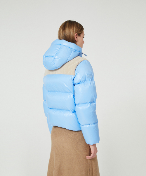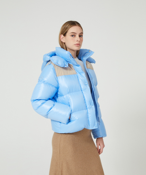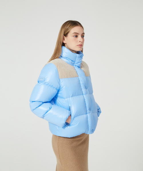 - 듀베티카의 시그니처 소재인 글로시 원단 소재와 벨벳을 콤비한 여성 푸퍼형 숏기장 중량 다운 자켓
