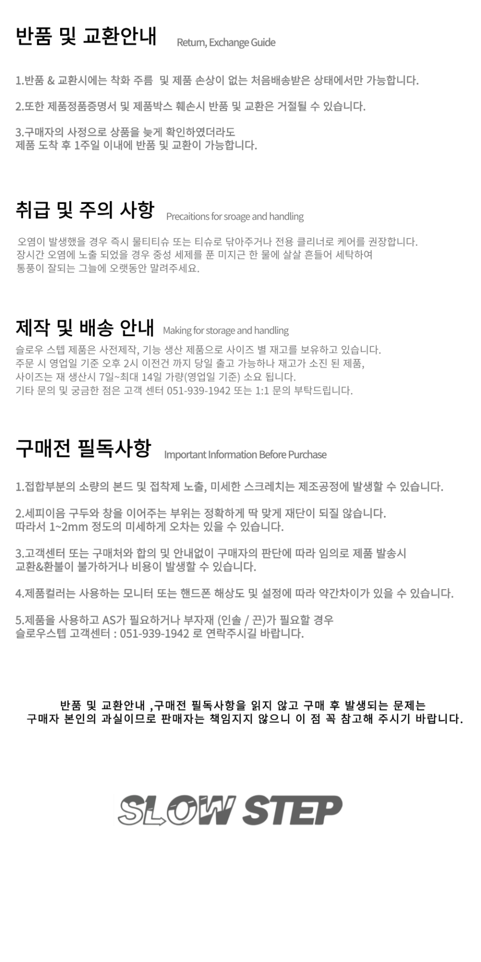 슬로우스텝은 완성도와 내구성을 최우선으로 하여 검수 기준을 엄격히 유지하고 있습니다. 이로 인해 제작 기간이 다소 길어질 수 있으나, 최상의 컨디션으로 전달드리기 위한 결정입니다.