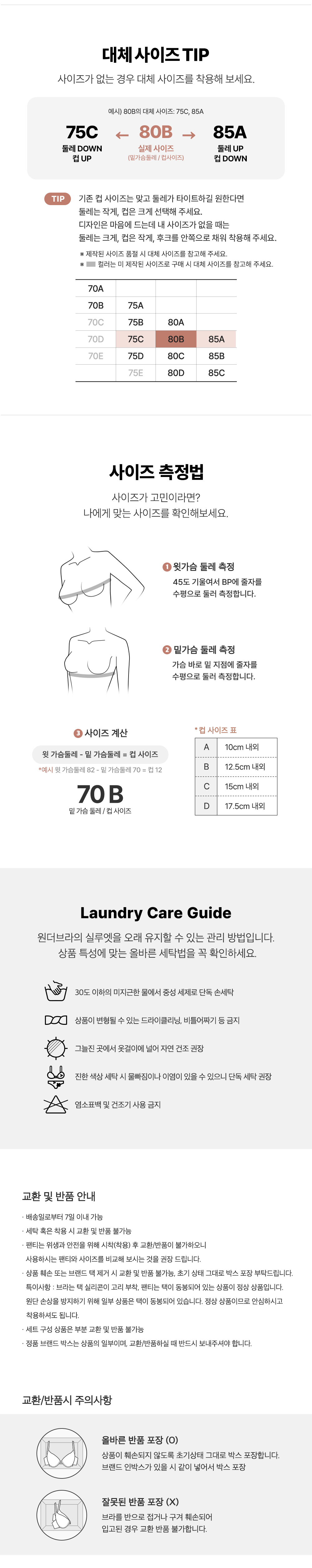 원더브라(WONDERBRA)는 1935년 시작됐습니다. 오랜 기술력에 현대적인 감각을 더해 완벽한 볼륨감으로 완성되는 원더브라는, 모든 여성에게 가장 이상적인 실루엣을 선물하는 브랜드입니다.