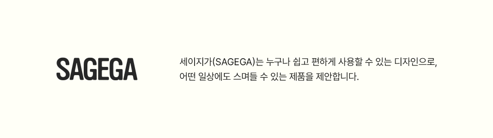 세이지가(SAGEGA)는 누구나 쉽고 편하게 사용할 수 있는 디자인으로, 어떤 일상에도 스며들 수 있는 제품을 제안하는 브랜드입니다.