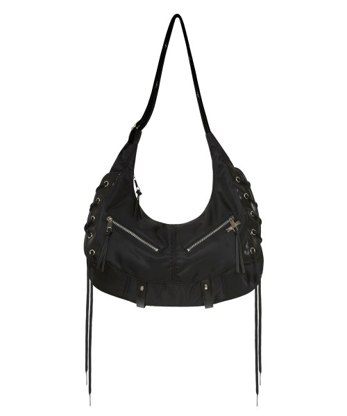 - 모토백 라인의 시그니처인 양쪽의 볼드한 메탈 사선 지퍼 디자인이 특징이며 이번 크로스백 라인은 양쪽에 아일렛과 레이스업 디테일을 두어 청키한 무드를 한껏 나타내는 디자인으로 제작되었습니다.