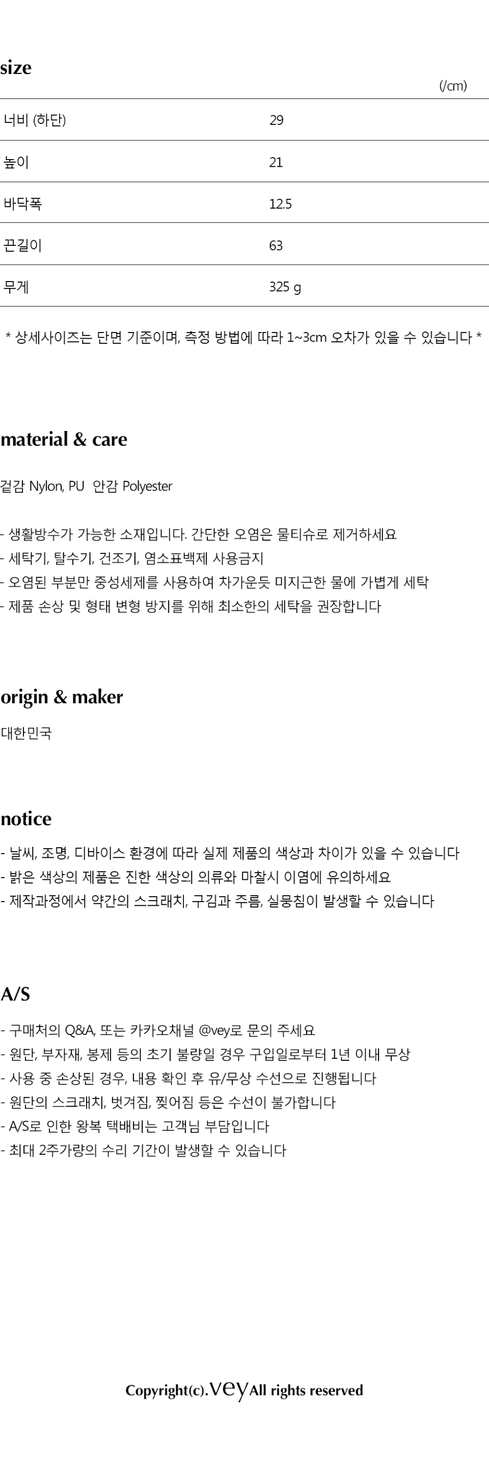 베이(VEY)는 'very easy'를 의미합니다. 새롭고 섬세하면서도 기본에 충실한 가방을 만듭니다. 취향을 기반으로 복장과 상황을 자유롭게 넘나드는 균형감을 지향합니다.