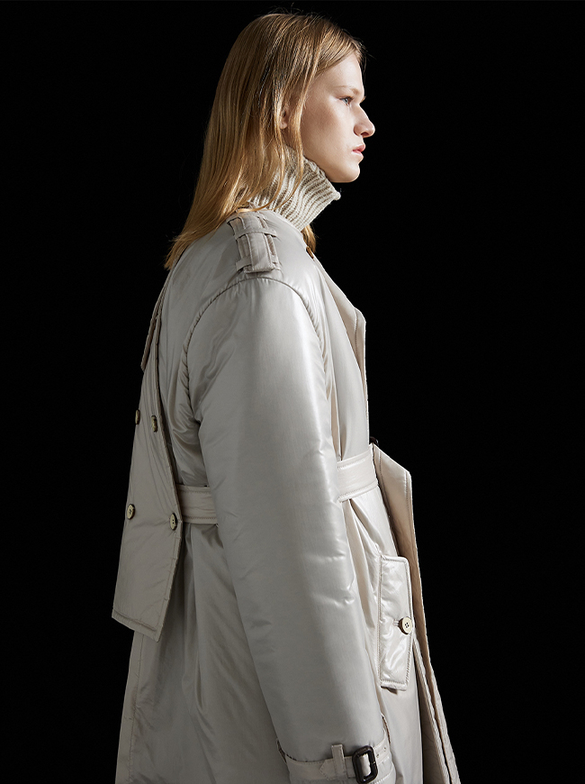 - 안정감있는 미니멀 실루엣에 시그니처 트렌치 케이프, 오리가미 디테일 접목