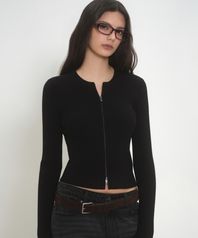 우먼즈 리브드 슬림 라운드 넥 니트 집업 [블랙]