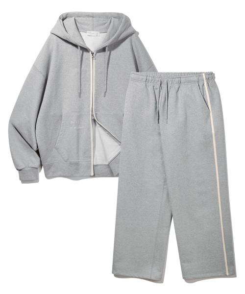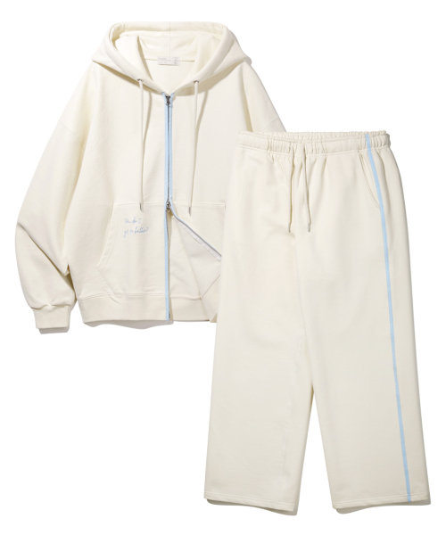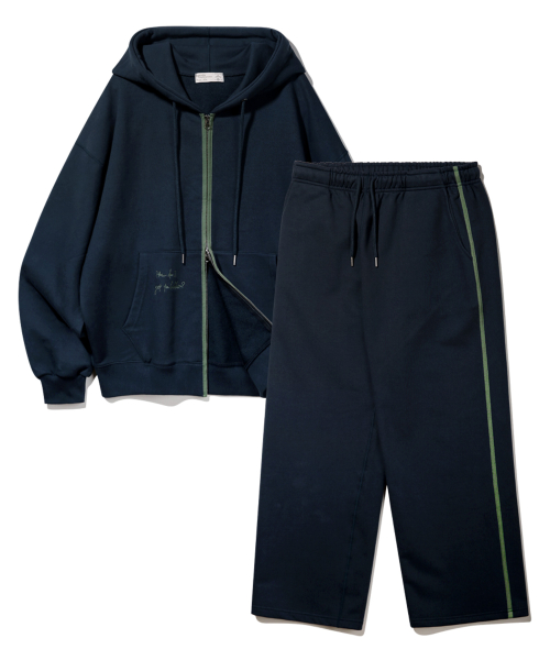 [SET] 포인트 포켓 레터링 자수 후드집업 세미와이드 스웨트 팬츠 셋업