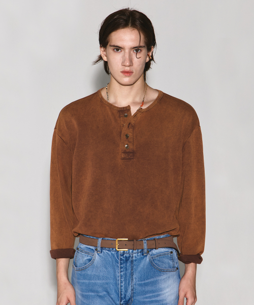 DEEP DYEING HENLEY NECK LONG SLEEVE BROWN
