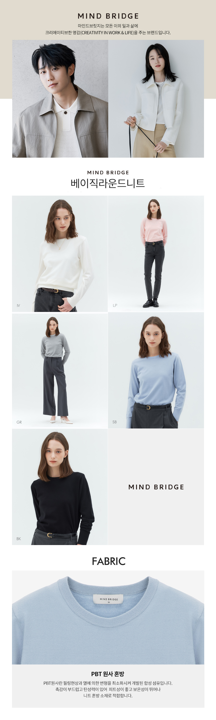 마인드브릿지 우먼(MIND BRIDGE WOMEN)은 ‘OFFICE CORE, TIMELESS MINIMALISM’이라는 키워드를 가지고 미니멀, 스타일리시함과 편안함이 공존한 스타일을 일과 일상의 경계 없는 모던한 컬렉션으로 제안합니다. 옷의 본질에 집중하되 구조적인 실루엣, 텍스처가 돋보이는 소재, 차분하고 정제된 색감의 팔레트를 사용하여 클래식 무드를 현대적인 세련됨으로 표현하였습니다.