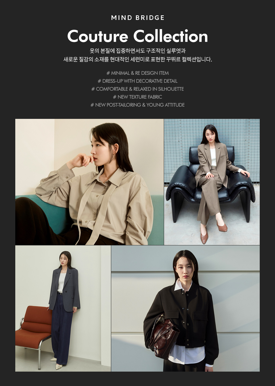 마인드브릿지 우먼(MIND BRIDGE WOMEN)은 ‘OFFICE CORE, TIMELESS MINIMALISM’이라는 키워드를 가지고 미니멀, 스타일리시함과 편안함이 공존한 스타일을 일과 일상의 경계 없는 모던한 컬렉션으로 제안합니다. 옷의 본질에 집중하되 구조적인 실루엣, 텍스처가 돋보이는 소재, 차분하고 정제된 색감의 팔레트를 사용하여 클래식 무드를 현대적인 세련됨으로 표현하였습니다.