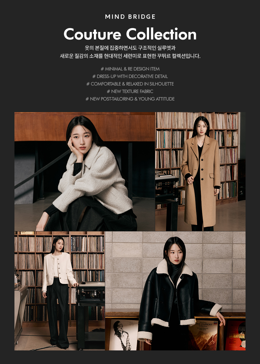마인드브릿지 우먼(MIND BRIDGE WOMEN)은 ‘OFFICE CORE, TIMELESS MINIMALISM’이라는 키워드를 가지고 미니멀, 스타일리시함과 편안함이 공존한 스타일을 일과 일상의 경계 없는 모던한 컬렉션으로 제안합니다. 옷의 본질에 집중하되 구조적인 실루엣, 텍스처가 돋보이는 소재, 차분하고 정제된 색감의 팔레트를 사용하여 클래식 무드를 현대적인 세련됨으로 표현하였습니다.