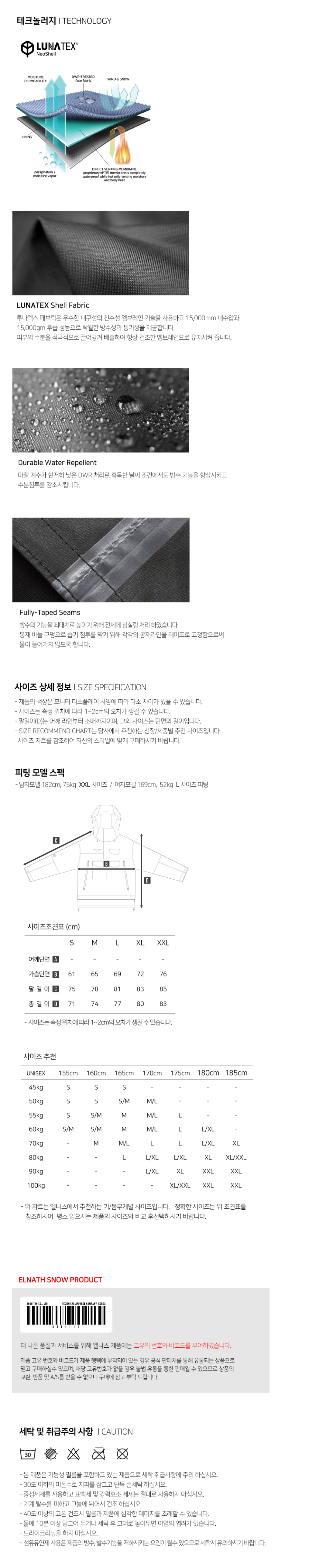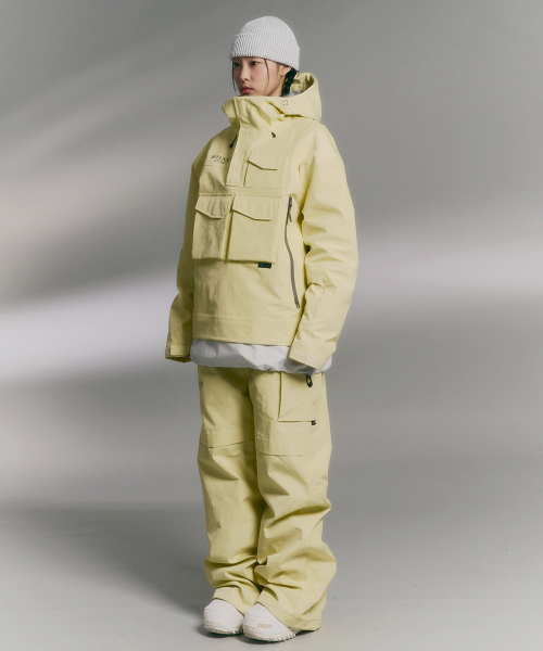 아노락 형태의 자켓으로 가슴 멀티 포켓과 Water Proof 사이드 포켓으로 스타일을 살린 제품입니다. 10,000MM 내수압, 10,000GM 투습 능력의 LUNATEX 멤브레인 사용하고 20g Tricot 3L본딩으로 원단 기능을 최대화 하고 제품 전체 심실링 처리로 방수, 투습기능을 업그레이드 하고 DWR 발수 마감 처리로 제품 표면의 오염을 줄일 수 있습니다. 80g/m2 PREMIUM Compression Wool을 충전재로 사용하였고, 탈부착 가능한 밑단 배색 파트는 레이어드 효과의 연출이 가능합니다.