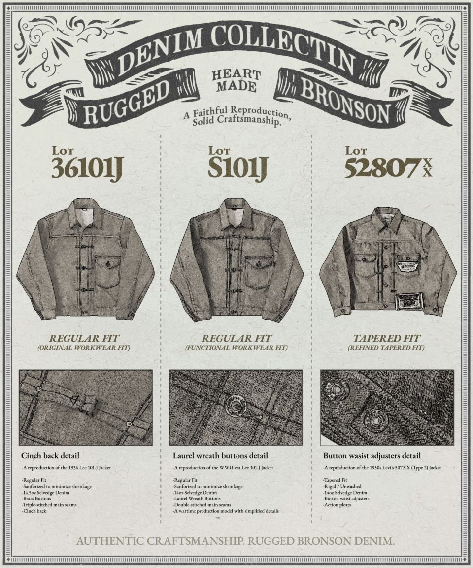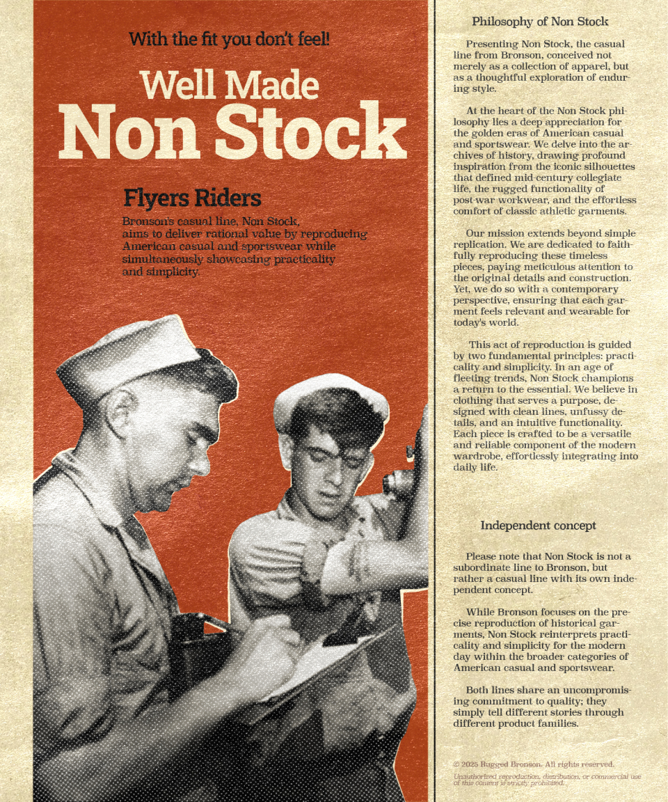 브론슨(BRONSON)은 오랜 의복을 토대로 모던한 요소를 더해 완성하는 정통 캐주얼 웨어를 추구합니다. 밀리터리, 아웃도어, 워크웨어, 빈티지 스포츠웨어 등 1970~1980년의 아메리칸 클래식에서 영감을 얻어 데님, 밀리터리, 캐주얼 등 폭 넓은 라인업을 전개하고 있습니다. 특히 기본에 충실하며 오랜 시간이 지나도 변함없이 함께할 수 있는 아이템을 생산합니다.