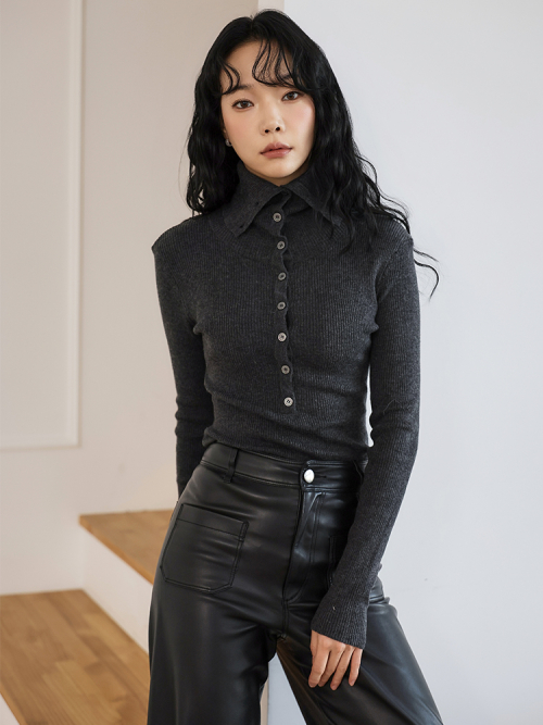 울 블랜딩 버튼 하이넥 니트