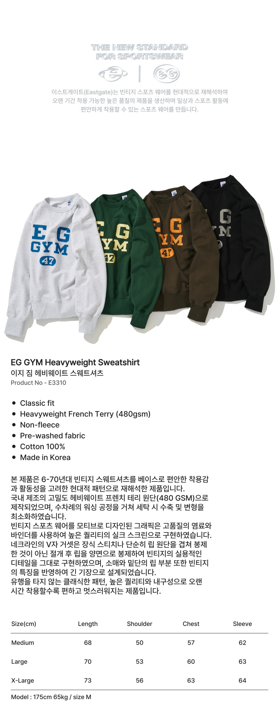이스트게이트(EASTGATE)는 빈티지 스포츠 웨어를 현대적으로 재해석하여 오랜 기간 착용 가능한 높은 품질의 제품을 생산하며 일상과 스포츠 활동에 편안하게 착용할 수 있는 스포츠 웨어를 만드는 브랜드입니다.