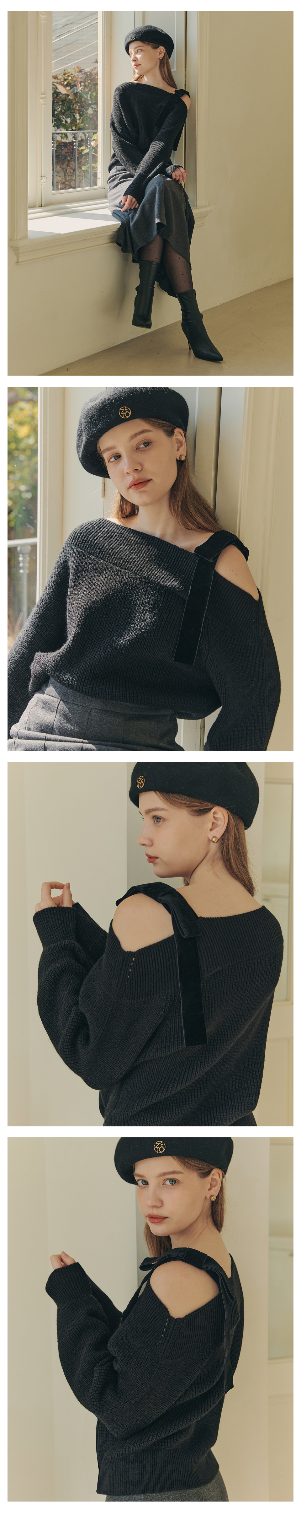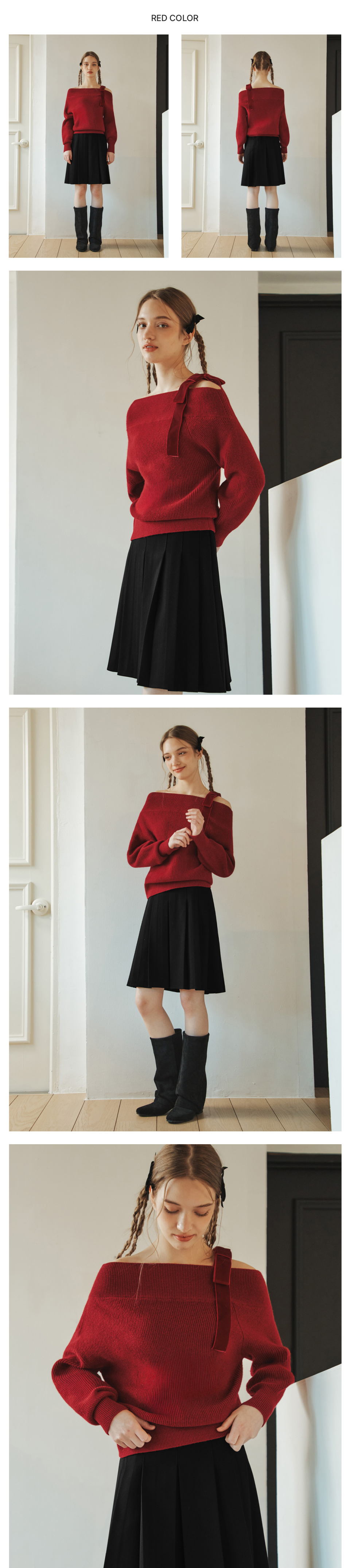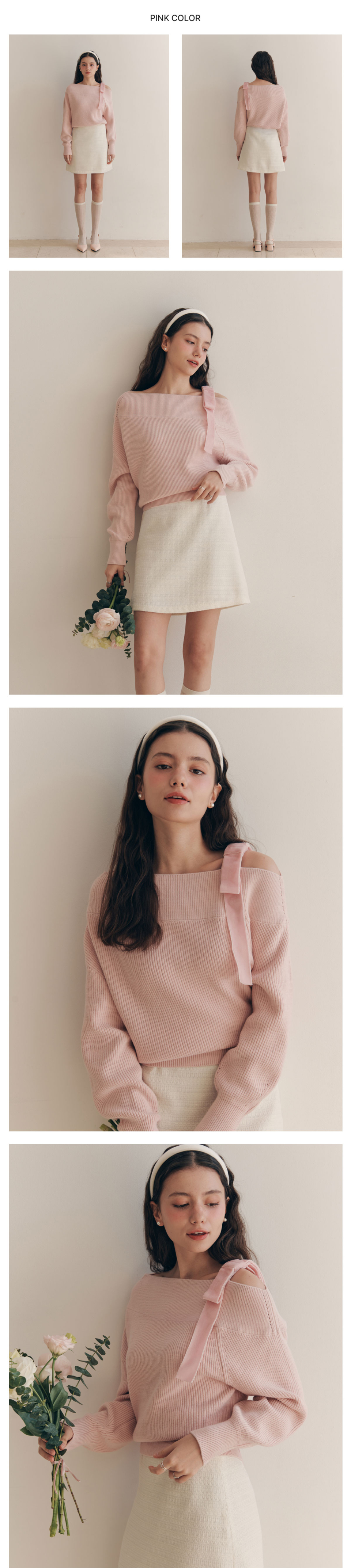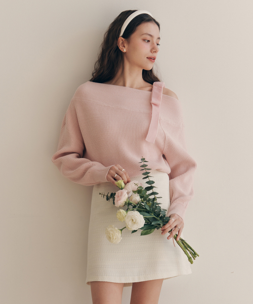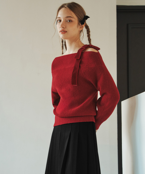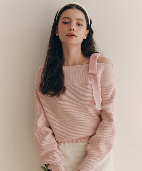 [4컬러] 리본 언발란스 오프숄더 스웨터