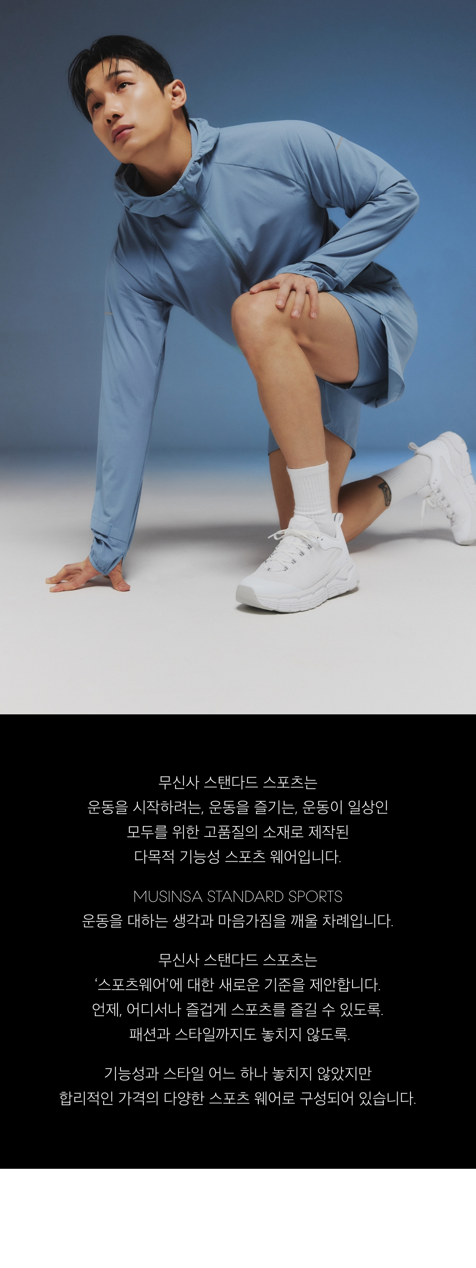 무신사 스탠다드 스포츠(MUSINSA STANDARD SPORTS)는 스포츠를 즐기는 고객을 위한 전문화된 소재와 기능성의 상품을 제공하는 기능성 스포츠 웨어 라인입니다. 일상에서 다목적 스포츠 활동을 즐기며 멀티 활용이 용이하도록 필요한 기능만을 탑재한 우수한 품질의 상품을 지향합니다.