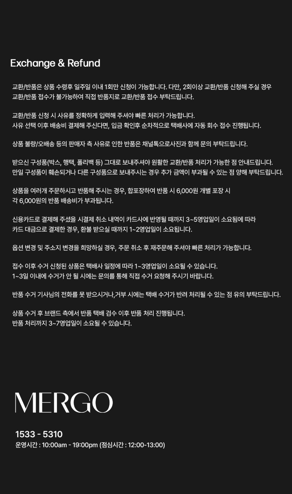 메르고(MERGO)는 합리적인 가격대와 품질로, 일상생활 어디에서나 스타일링 가능하며 차분하지만 매력적인 감도의 남성복 브랜드입니다.