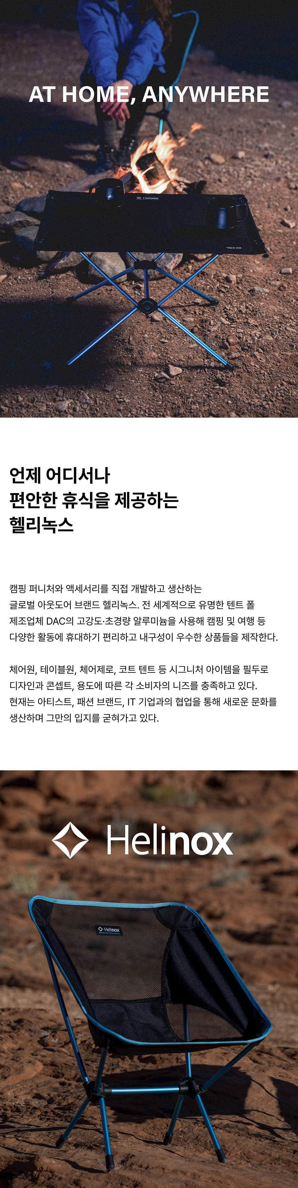 HELINOX(헬리녹스)는 전 세계 90% 이상의 텐트 브랜드에서 사용하는 텐트 폴 제조업체인 DAC의 TH72M 소재를 이용한 고강도·초경량 알루미늄을 사용한 캠핑 퍼니쳐를 생산하는 브랜드입니다. 디자인과 컨셉, 용도에 따라 여러 라인으로 제품을 구성하여, 여러 소비자들의 needs를 충족시키기 위해 노력하고 있습니다. 패션과 아웃도어를 연결하는 수많은 컬래버레이션을 통해 세계적인 주목을 받는 브랜드입니다.