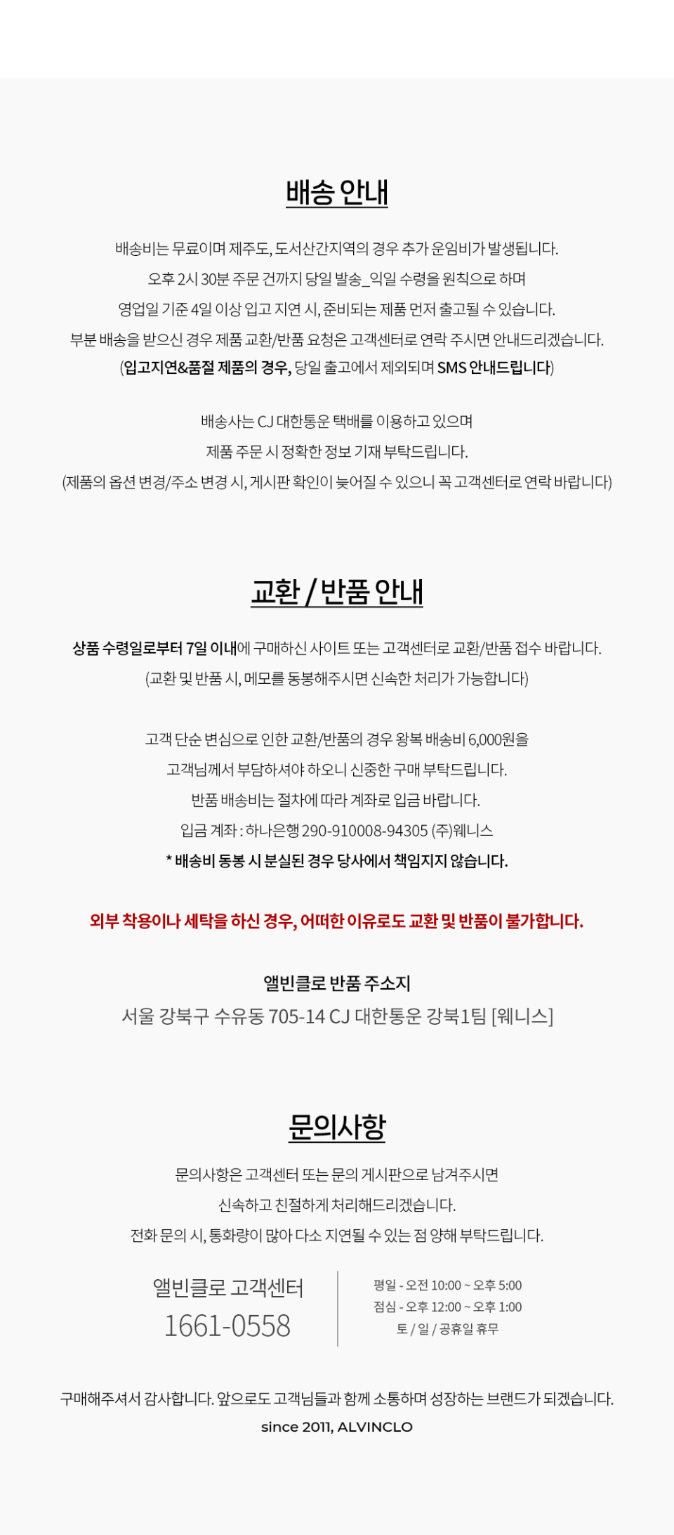 앨빈클로(ALVINCLO)는 '옷을 입는 한 사람'으로서 언제 어디서나 편안하고 트렌디한 옷을 만들기 위해 끊임없이 노력하고 성장하고자 합니다. 다양하게 변화하는 디자인 흐름 속에서 본질에 충실하면서도 유니크한 디자인을 선보입니다. 또한, 론칭 이후 지금까지 국내 원단 사용&생산을 고집하고 있으며 철저한 품질 관리를 통해 눈치채기 힘든 부분까지 디테일하게 관리합니다.