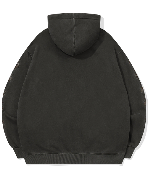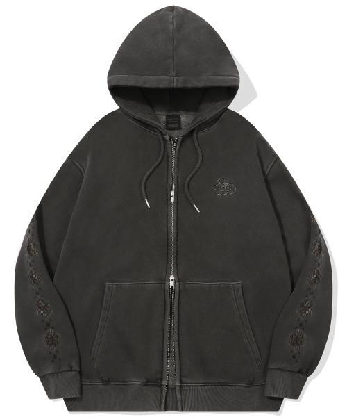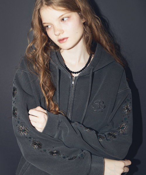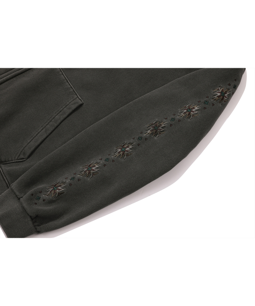 자수 아트웍이 피그먼트 워싱되며 가공 처리하여 유니크한 무드를 연출했습니다.
