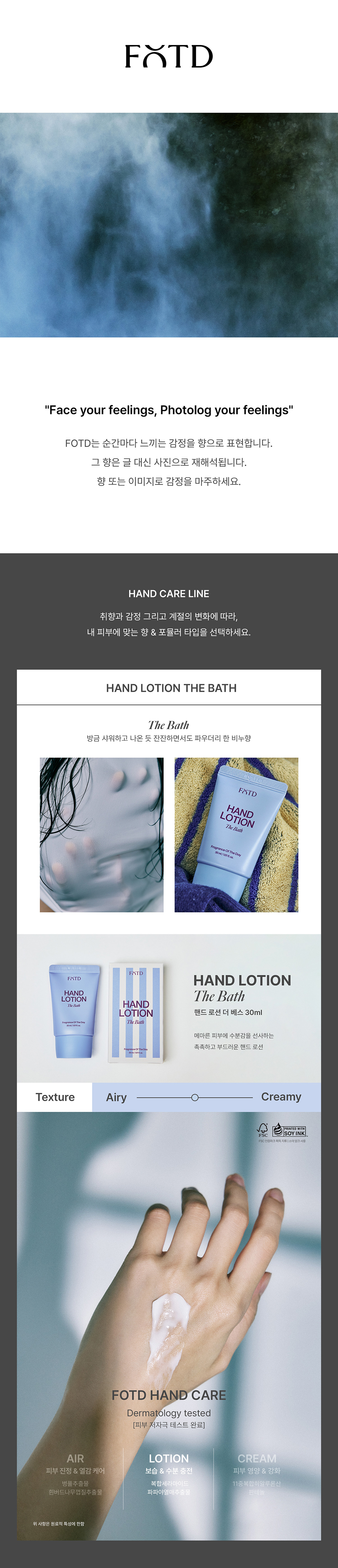 에프오티디(FOTD)는 'Fragrance of the day'의 축약어로 '오늘의 향'이라는 뜻을 담은 라이프 스타일 프래그런스 브랜드입니다. 그날의 감정을 향으로, 그 향을 사진으로 디자인하여 제품을 표현합니다.